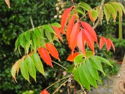 ※櫨の木(はぜのき):ウルシ科ウルシ属の植物。単に「櫨」とも。6月頃に円錐状の黄緑色の小花を咲かせます。雄株には灰色の小果が実り、これから「蝋(ろう)」が採れます。「山漆(やまうるし)」によく似ていて、触るとカブレるので注意。天正年間(1570年頃)に中国から種子で伝わり、「蝋燭の原料」として筑前で栽培され九州一円に広まりました。紅葉は、赤色がモミジより美しく鮮やかです。