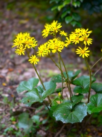本州中部以西、四国、九州、朝鮮半島、中国の海岸近くに自生。観賞用に庭園や茶庭に植えられ、いくつかの園芸品種もあります。腎臓形で厚く、上面に光沢を持つ葉が根生し、そこから伸びる茎の高さは60cmほど。初冬に、鮮やかな黄色の花がいくつかまとめて咲きます。花は、直径5cm前後の頭状花序(とうじょうかじょ)で菊に似ています。